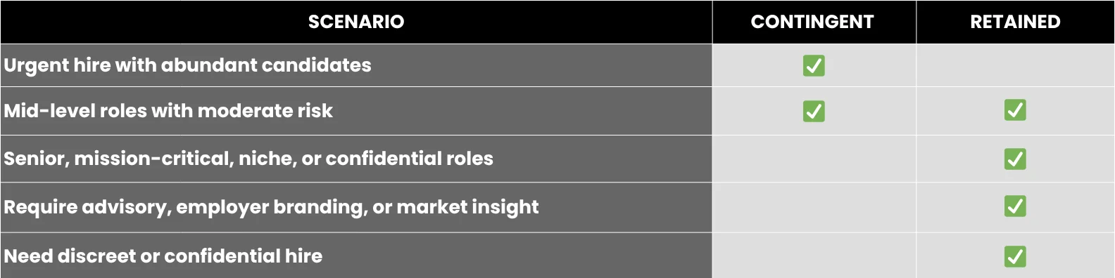 Contingent recruitment has a place for urgent or volume hiring, but it rarely delivers the same depth, quality, or long-term value. Organisations that invest in retained recruitment gain access to a trusted partner, a more controlled process, and candidates who are more likely to thrive and stay in their roles.